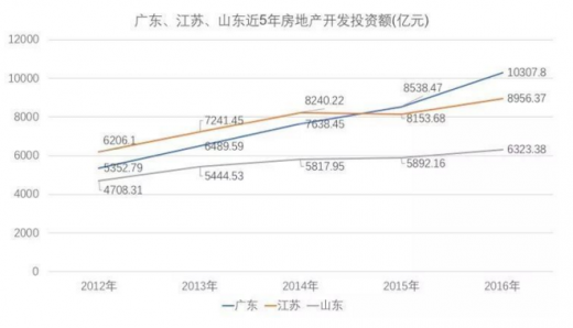 上图是三省的房地产投资,可以看出,山东远远落后与广东、江苏,尤其是从2014年开始,增速非常低。
