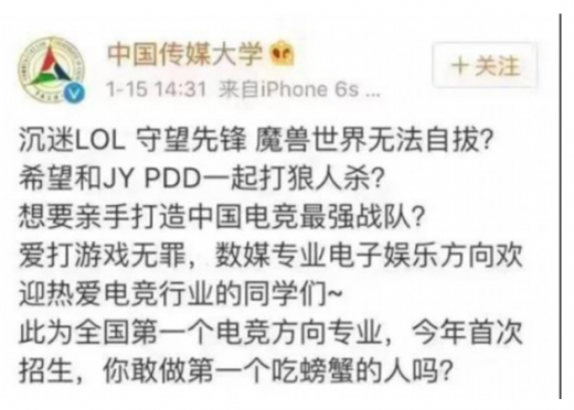 2016年12月21日,中国传媒大学南广学院在云顶国际yd888官网上贴出了2017年的本科招生专业以及学费,而n19号专业则赫然是艺术与科技(电子竞技分析方向),招生计划为40人。