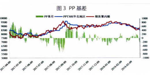 3月份pp期货价格以持续震荡下跌走势。截至3月30日,以华东地区t30s价格计算,基差为35元/吨(主力为p1805合约,现货价格按照华东市场价格)。详见图3。