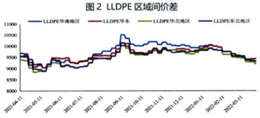 lldpe区域间价差中,华北地区价格下跌速度较快,华南和华东地区价格维持稳定,3月底全国主要地区价格维持在9287~9480元之间。详见图2。