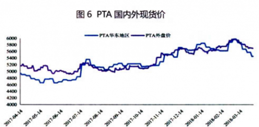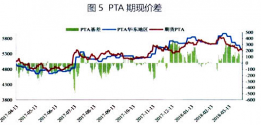 3月份pta期货价格全月呈现震荡下跌走势。截至3月30日,以华东地区pta价格计算,基差为28元/吨(主力为pta1809合约,现货价格按照华东市场价格)。详见图5。