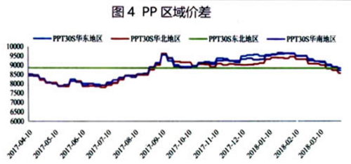 pp区域间价差变动不大,现货市场3月份价格整体表现为下跌,3月底华东地区价格下跌到8848元/吨。详见图4。