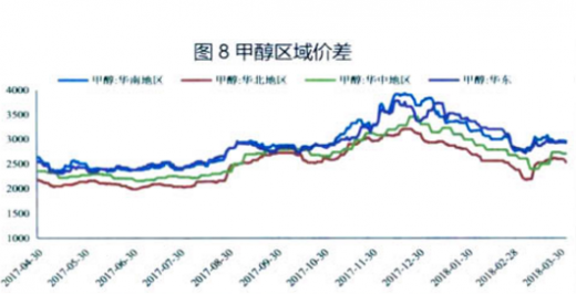3月份甲醇现货价格呈现底部震荡走势。目前华东、华南和华北现货价格保持在2930元/吨,2965元/吨和2595元/吨。详见图8。