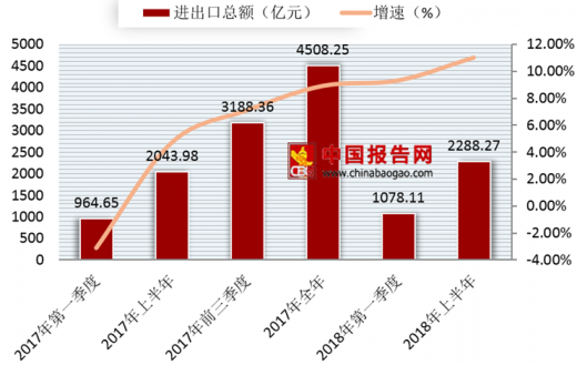 市场销售稳定增长,对外贸易出口结构继续优化 。上半年,社会消费品零售总额同比增长10.1%。按经营单位所在地分,城镇消费品零售额增长10.0%;乡村消费品零售额增长12.3%。重庆市进出口总值2288.27亿元,同比增长11.0%。其中,出口为1470.48亿元,增长13.8%;进口为817.79亿元,增长6.5%。