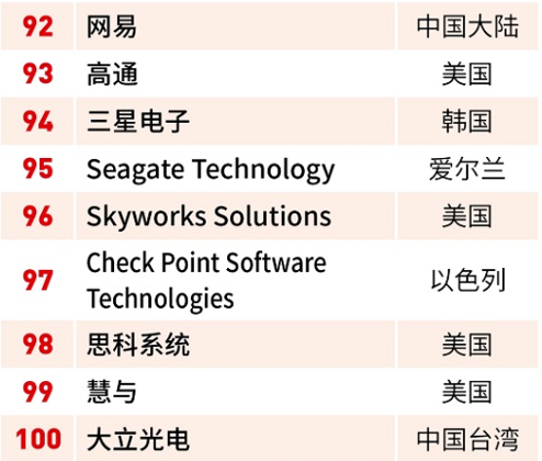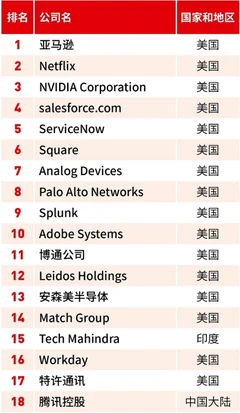 上榜企业来自17个国家和地区。其中美国数量最多,有49家企业上榜;中国22家企业上榜,位居第二。在中国的上榜企业中,腾讯控股排名居首,在百强榜单中排名第18位。