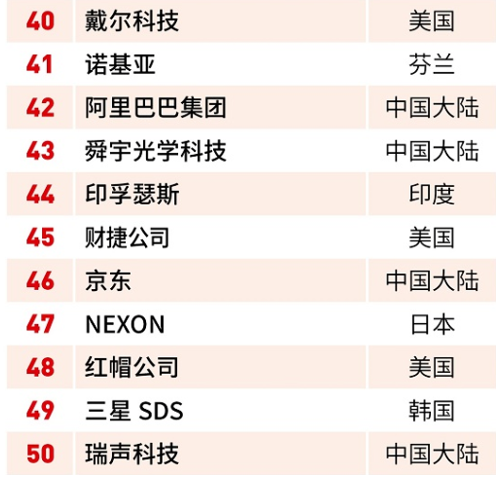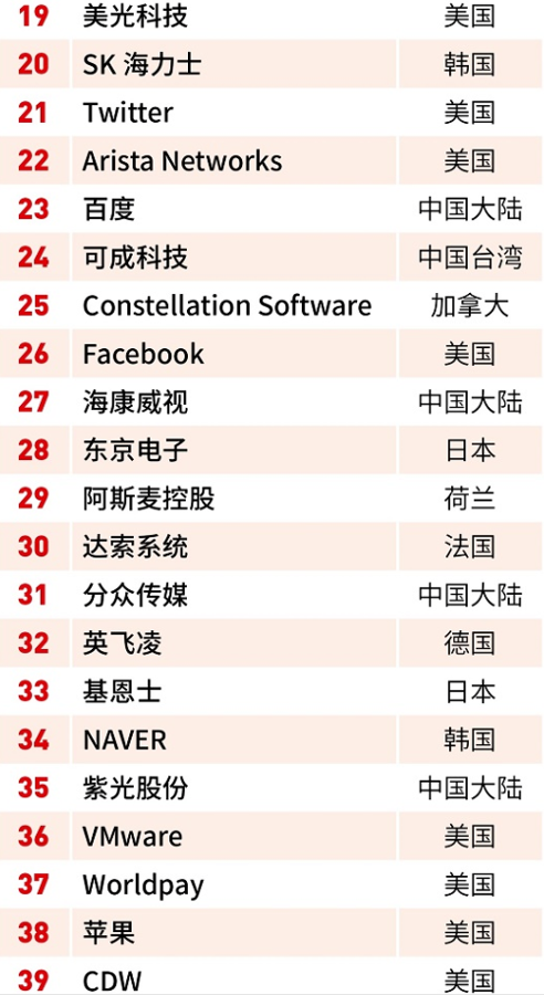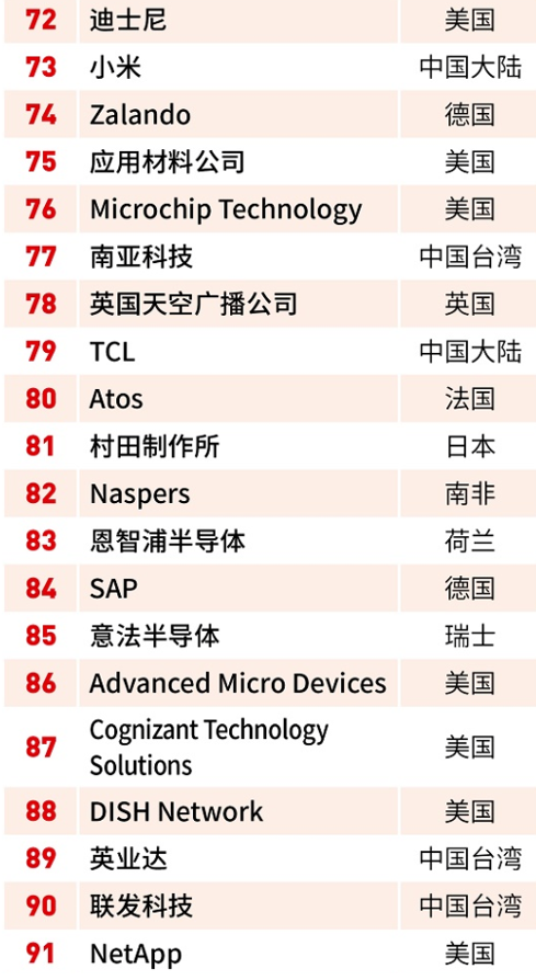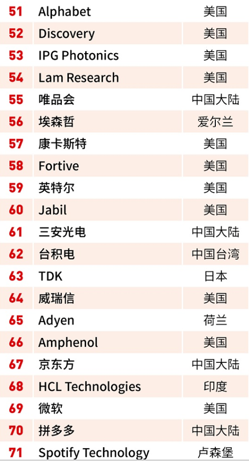 22家中国上榜企业为中国大陆的腾讯控股、百度、海康威视、分众传媒、紫光股份、阿里巴巴集团、舜宇光学科技、京东、瑞声科技、唯品会、三安光电、京东方、拼多多、小米、tcl、网易,中国台湾的可成科技、台积电、南亚科技、英业达、联发科技、大立光电。