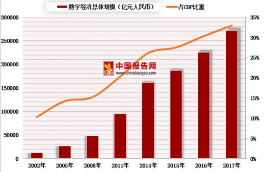 根据中国信通院最新发布的白皮书显示,从总的来看,近年来中国数字经济规模快速增长,占gdp比重持续上升。2017年我国数字经济总量达到27.2万亿元,同比名义增长超过20.3%,显著高于当年gdp增速,占gdp比重达到32.9%,比上年提升了2.6个百分点。