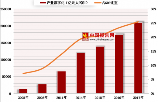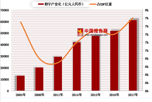 2017年,数字产业化部分规模为6.2万亿元,同比名义增长18.4%,占gdp比重为7.4%;