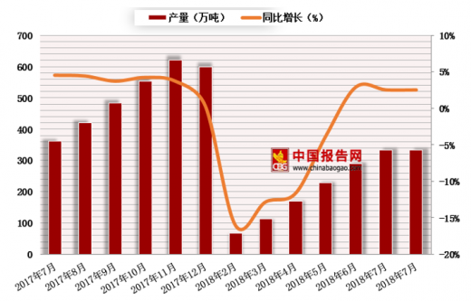 2017年国内钾肥产量达到599.7万吨,同比增长0.3%。今年国内钾肥产量基本稳定,截至2018年1-7月,全国钾肥产量为332.8万吨(k2o),同比增长2.5%。