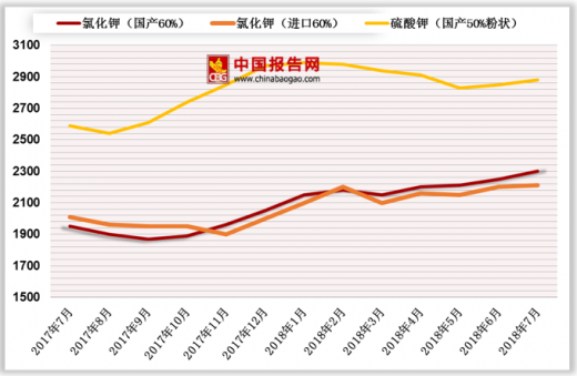 钾肥价格持续上升。随着价格上涨以及下游需求增多,钾肥价格也开始从底部回升。截止到2018年7月,我国60%含量的氯化钾价格已上涨至2,300元/吨,同比增长17.9%,环比增长2.2%,累计均价达到2206元/吨。