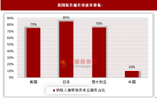 面对我国税收收入的不断增长,国内涉及到的产业不断增多,税收服务伴随着我国税收市场的发展而逐渐成长。税收服务是传承于1884年美国的注册代理人制度,经过多年的发展,在西方等发达国家税收服务市场较为成熟。相对于国外,我国税务服务市场发展还处于初级阶段,日本85%以上的企业、美国50%以上的企业和接近100%的个人都委托税务代理,而我国税务代理的纳税人不超过10%。