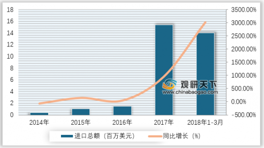 从进口额方面来看,2014-2017年我国氢氧化锂进口金额年复合增长率为232.07%。2018年1-3月我国氢氧化锂进口金额为14.02百万美元,与上年同期相比增长了3,015.56%。2017年我国氢氧化锂进口金额为15.38百万美元,与上年同期相比增长了953.42%。