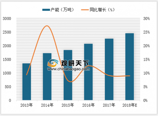 2013-2017年我国聚丙烯产能规模逐年增长,2017年为2247万吨,同比增长9.02%。西北、华南、华东、西南地区均有不同程度的增长,其中西北地区新增76万吨/年,华南地区新增35万吨/年,华东和西南分别新增30、15万吨/年。