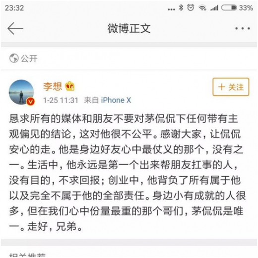 在北京这个冬天最寒冷的日子,茅侃侃在微信朋友圈留下一句话:“嗯,我爱你不后悔,也尊重故事的结尾。”,告别了人生,告别了创业,告别了这个世界,令人感慨万千。