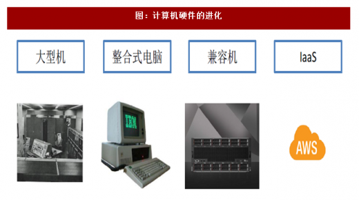 自从计算机的鼻祖eniac 在1946 年出现后, 计算机在1951 年首先进入了univac(universal automatic computer)的大型机时代。在1981 年,ibm 推出了5150 系列首台个人电脑,这时的个人电脑是一套整合式的设备。随着ibm 开放了pc 标准,x86 兼容机逐渐成为市场主流。在2006 年,aws(amazon web services)为代表的saas 服务商开始商用。在大型机->小型机->兼容机->saas 的过程中,标准化程度越来越高。