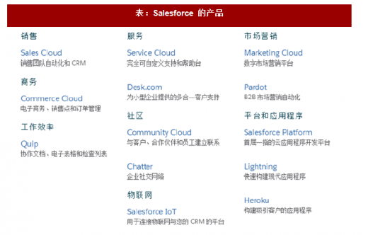 不仅仅是saas 厂商,saas 厂商同样是如此。salesforce 除了传统的销售、服务、营销和云平台等产品。还在积极拓展移动、社交、健康、订单自动化、营销自动化等一系列新的产品,采用交叉销售的策略,力求从每个客户获取更多的收入。