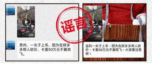 拼多多方面表示,这条1年前的视频,被别有用心者配以“拼多多砍价”等文字,捏造出湖北、贵州等地女子因砍价被骗轻生的谣言,引发了消费者恐慌。