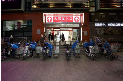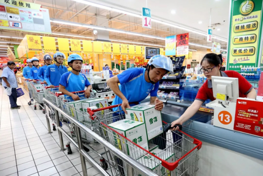 为了提高效率,6个饿了么小哥一起取货、排队、结账,一边的大爷大妈们表示一脸懵。