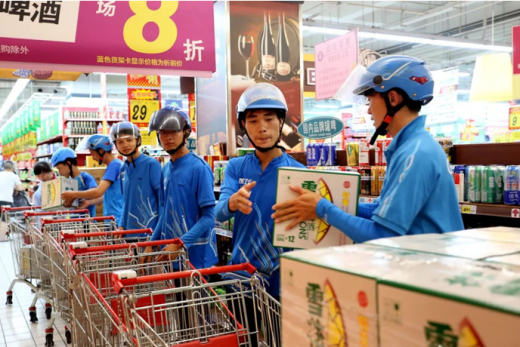 当时,普陀区延川路91号的蜂鸟配送站内, 外卖小哥吴应兵正看球呢,突然接到这个订单后,一个鲤鱼打挺,迅速动了起来!世界杯期间,球迷热情高涨,啤酒预订量大增,300瓶啤酒意味着25箱,怎么运送是个难题。吴应兵喊上了其他5名小哥,“走!去大润发曹安店搬货!”