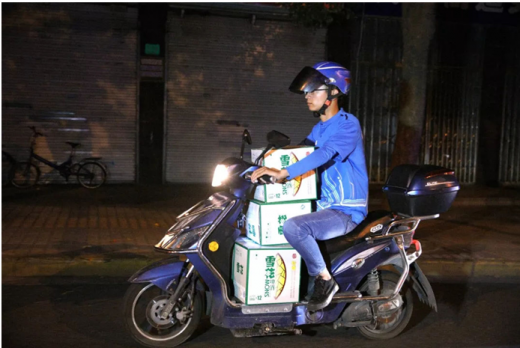 饿了么送餐箱里可以放一箱,每辆摩托车脚踏板前可以叠放三箱。小哥们个个面部神情严肃,车都比往常稳了一些。