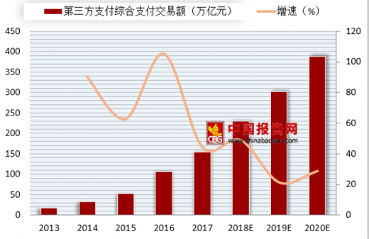 根据数据显示,2016年中国第三方移动支付交易规模达到58.8万亿元,同比增长率超300%,达381.9%。随着智能手机的普及和二维码支付市场的爆发,消费者从pc端向移动端的迁移速度加快,预计2018年中国第三方移动支付交易规模将超150万亿元,达到171.5万亿元,增长率为68.0%。
