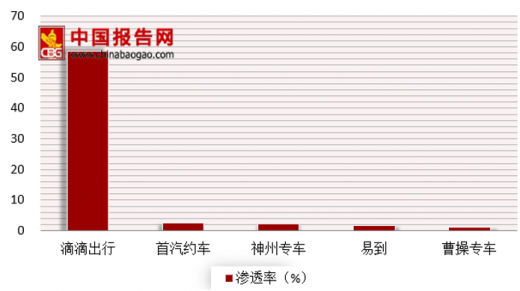 从平台渗透率方面来看,2017年滴滴出行位居各平台之首,其渗透率高达58.6%。而目前下载量猛涨的曹操专车的渗透率只有1.3%。