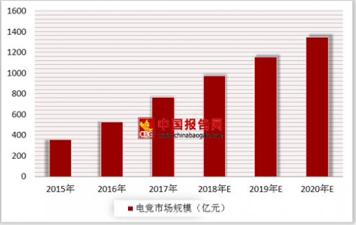 2017年中国电子竞技游戏市场规模达到766亿元,同比增长46%:其中,客户端电子竞技游戏市场实际销售收入达到367.0亿元,同比增长14%;而移动电子竞技游戏市场实际销售收入达到329亿元,同比增长100.6%,2017年电子竞技产业增长主要来源于移动端的爆发。未来电竞增速将放缓,年增长率保持在18%。预计2020年,中国电竞市场将达千亿产值。