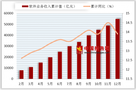 软件行业保持快速发展 2017 年 1-12月,我国软件和信息技术服务业共完成软件业务收入 55037 亿元, 同比增长 13.90%,增速低于去年同期 0.8 个百分点。此前,受软件行业整体规 模扩大、经济增速放缓等因素影响,软件行业月度累计增速在 2016 年下滑至 13%左右,收入增速随后逐步企稳并在 2017 年下半年边际递增,预计随着经济 缓慢复苏,软件行业的收入将会持续稳健增长,预计全年增速有望继续维持在 13%-14%的增速区间。我们认为,由于国家不断推进大数据、互联网 、等新兴产业发展,智能制造、工业互联网等新概念的提出也将进一步推动软件 在产业中的渗透率持续提升,预计软件产业景气度将维持。
