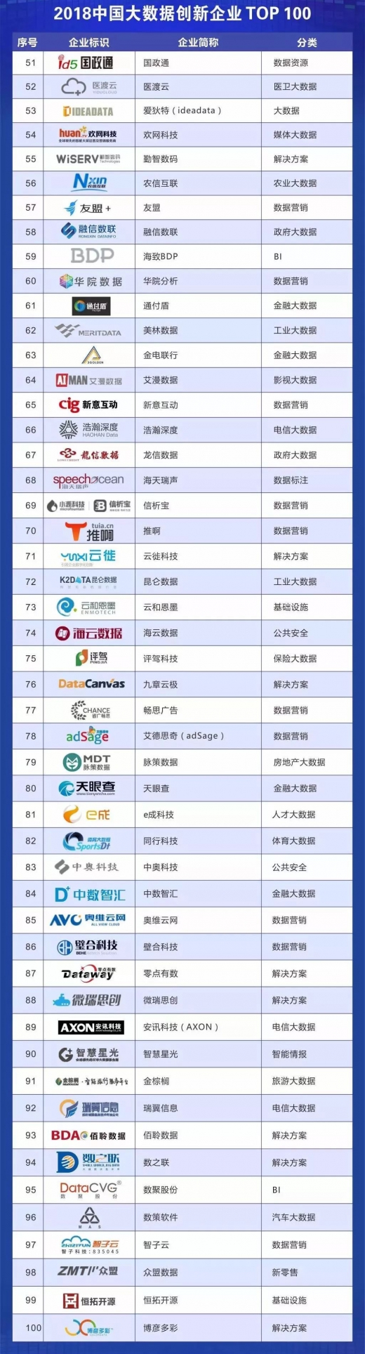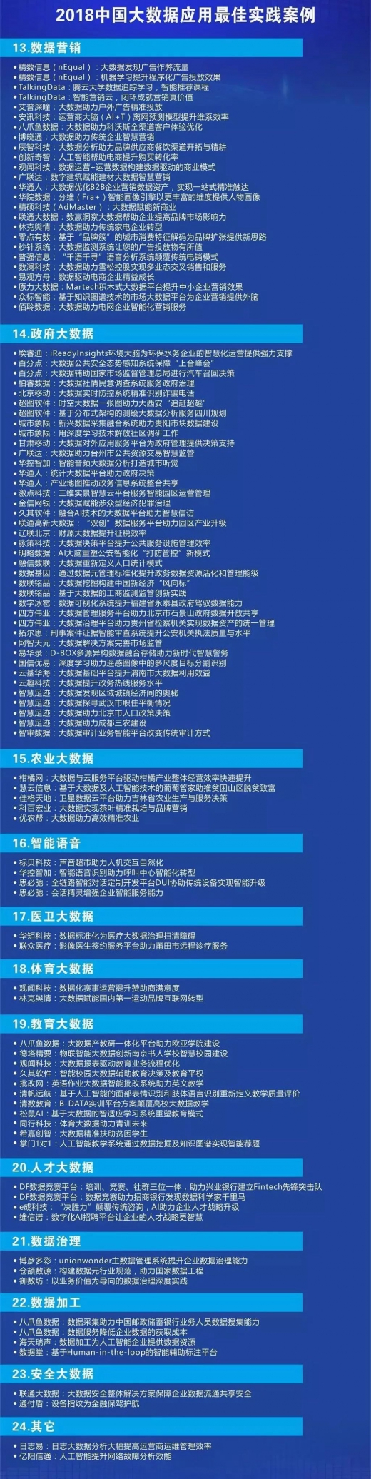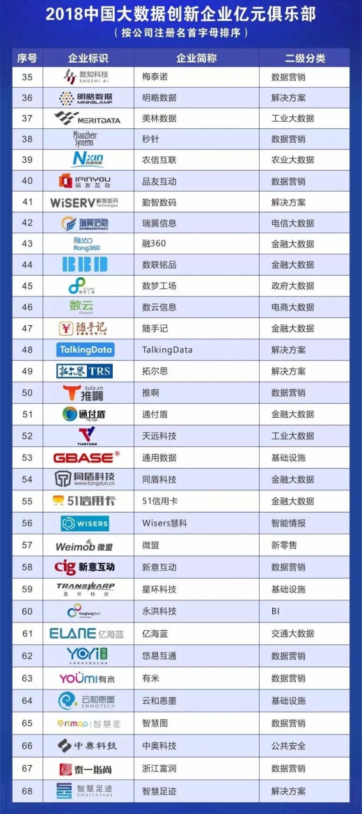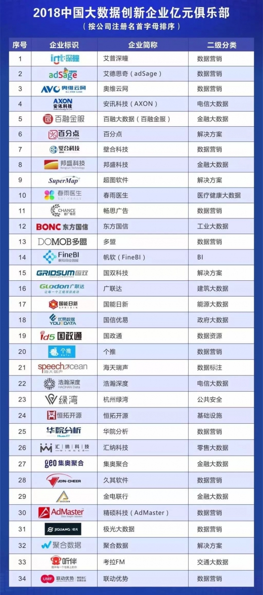 2018年,评选模型进行了优化迭代,从创新能力与行业贡献、行业应用最佳实践案例与收入增长、人均产值、品牌市场与行业认可、产品与方案成熟度四大维度27项进行考核,最终遴选出《2018中国大数据创新企业top100》。