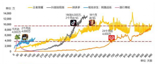 内容为王的时代给了新的产品绝佳的发展机遇,新的典型app“爆发力”增强,对百万级、千万级用户的获取时间越来越短,旅行青蛙半个月的时间达到4,000万日活跃用户规模,抖音短视频日活跃用户规模从4,000万增长到1亿仅用时2个月。