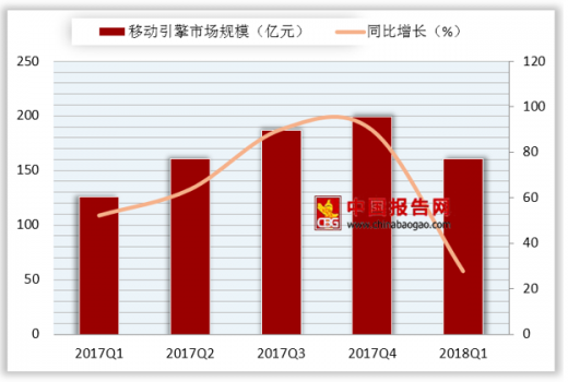 2018年1季度,中国移动搜索引擎市场规模达到160.54亿,同比增长27.5%,增速有所下滑。