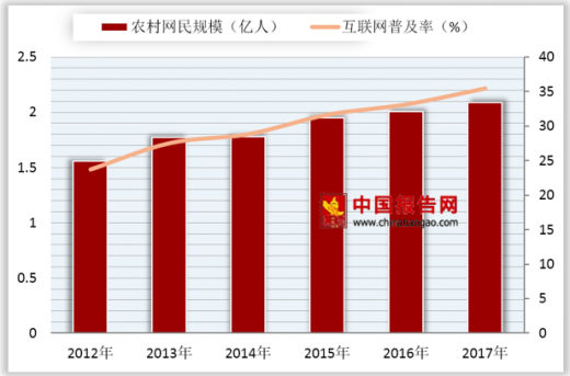 2012-2017年,我国农村网民规模持续增长,由2012年的1.56亿人增长至2017年的2.09亿人。截止至2017年12月,我国农村地区互联网普及率为35.4%,年均提升2.34个百分点。随着农村信息网络基础的改善和农村居民生活水平的提高,未来农村地区互联网普及率和农村网民规模还将进一步提升,进而带动我国农村电商进一步发展。
