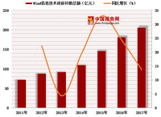 2011-2017年wind信息技术类公司政府补助总额及同比增长