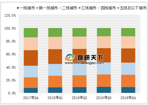 根据数据显示,从17年q4至18年q3,一线、新一线和二线城市的移动网民占比持续攀升,该趋势在18年q4有所缓和。截至2018年q4,分布在二线及以上城市的移动网民占比46.7%,较17年q4增长4.6%。