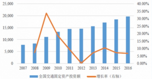 交通固定资产总投资额决定着相应业务的市场规模。2017年,中国经济仍处于结构转型升级与“去产能、去库存、去杠杆、降成本补短板”的改革深化、红利释放的等待期。必须加大固定资产投资、尽早实现的转型升级,以进一步拉动中国经济增长。交通运输业作为基础设施建设业的重要抓手,促进交通运输业提质降本增效,是深化供给侧结构性改革的有效途径和重要内容。