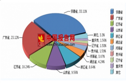我国电冰箱产量比重主要集中在安徽省、广东省、江苏省、山东省、浙江省、湖北省、河南省、贵州省、辽宁省、重庆市、其它等地区。其中:安徽省完成累计产量3058.8万台(占33.11%),同比增长5.84%;广东省完成累计产量2135.51万台(占23.12%),同比增长8.34%;江苏省完成累计产量945.75万台(占10.24%),同比增长-4.08%;山东省完成累计产量883.42万台(占9.56%),同比增长1.23%;浙江省完成累计产量797.74万台(占8.64%),同比增长15.82%;湖北省完成累计产量392.06万台(占4.24%),同比增长36.33%;河南省完成累计产量283.74万台(占3.07%),同比增长-15.37%;贵州省完成累计产量146.99万台(占1.59%),同比增长-15.59%;辽宁省完成累计产量145.74万台(占1.58%),同比增长-0.92%;重庆市完成累计产量144.16万台(占1.56%),同比增长-19.81%;其它完成累计产量304.42万台(占3.3%),同比增长2.63%。