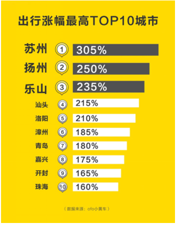 除一二线主流城市外,大众五一出游也将集中在旅游资源丰富型的中小城市。共享单车涨幅最高的top10城市也均为旅游型中小城市,出行涨幅均超过160%。其中,苏州、扬州、乐山、汕头、洛阳涨幅均将超过200%,苏州出行涨幅将达到305%。