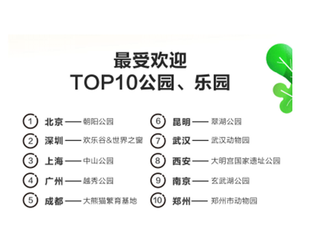 除知名景点外,公园、动物园、游乐园也将成为大众五一出行的热门地点。北京朝阳公园、深圳欢乐谷和世界之窗、上海中山公园、广州越秀公园、成都大熊猫繁育基地、昆明翠湖公园、武汉动物园、西安大明宫国家遗址公园、南京玄武湖公园、郑州市动物园,将成为共享单车五一出行热门的top10公园、乐园。
