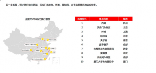 对于热门骑行景区、骑行路线,该《报告》也进行了相关预测。数据显示,五一假期共享单车出行的top10热门景点将依次为:杭州西湖、北京天安门和故宫、上海外滩、北京颐和园、厦门厦门大学和南普陀寺、南京夫子庙、成都宽窄巷子、西安大雁塔和大唐芙蓉园、武汉黄鹤楼、成都武侯祠和锦里。
