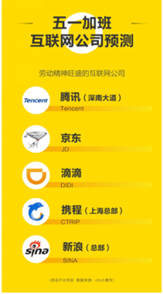 《报告》还对五一期间加班较多的互联网公司进行了预测。根据节假日去往互联网公司办公地(《报告》选取的地点均为企业独立办公楼)加班的累积出行人次的历史数据计算,预计腾讯(深南大道)、京东、携程(上海总部)、滴滴、新浪(总部)将成为五一加班人最多的互联网公司办公地。