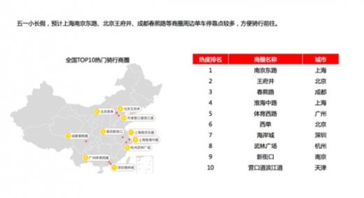 在全国top10热门骑行商圈排行中,上海南京东路成为五一期间“剁手党”们最可能集中光顾商圈。除此之外,北京王府井、成都春熙路、上海淮海中路、广州体育西路、北京西单、深圳海岸城、杭州武林广场、南京新街口、天津营口道滨江道等商圈周报,因为共享单车停靠点较多,也可能成为大家集中前往的热门骑行商圈。