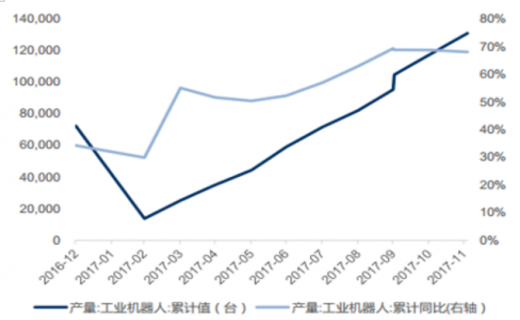 近 5 年来我国机器人市场保持高速增长态势,预计未来行业增速仍将维持 20%以上。数据显示,2017年我国年销量预计为 11.5万台, 2018-2020 年复合年均增长率为 22%, 2020 年我国工业机器人市场规模将可达到 378 亿元。