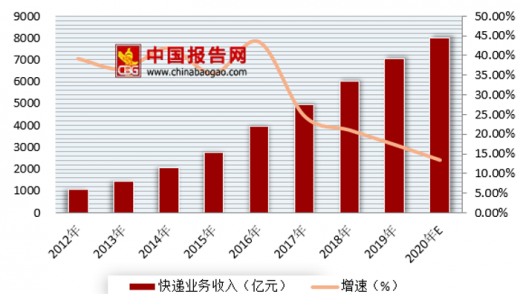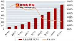 根据数据显示,“十二五期间”,国内快递业务量连续5年维持在50%左右的高增长,在2014年我国快递业务量就已跃居世界第一。截止到2017年,国内快递业务量达到400.6亿件,业务收入达到4957亿元。根据预测分析,到2020年快递业务量将达到700亿,业务收入接近8000亿元。据测算,2018-2020快递业务量复合增长率为19.5%。