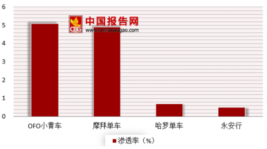 根据预测分析到2018年我国共享单车市场规模将超170亿元。数据显示,截止2017年12月,我国市场上渗透率最高的是ofo小黄车,为5.1%;其次是摩拜单车,其市场渗透率为4.9%。