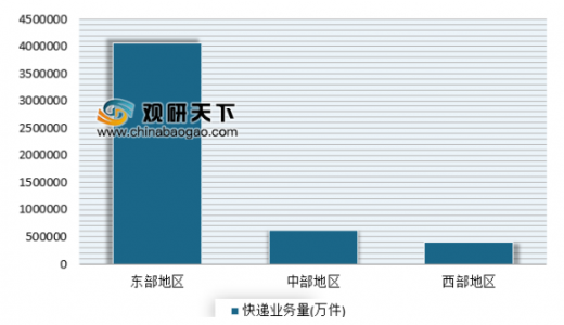 数据显示,2018年我国东部地区完成快递业务量4050204万件,比去年同期增长24.6%。中部地区完成快递业务量624271.4万件,比去年同期增长34.8%。西部地区完成快递业务量396567.1万件,比去年同期增长35.5%。