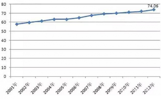 根据前瞻产业研究院发布的《2013-2017年中国烟草制品行业产销需求与预测分析报告》,2001-2012年,中国烟草制品行业毛利率维持在57%以上的较高水平,且呈现逐年上升的态势,到2012年行业的毛利率达到了74.06%。